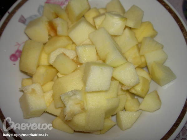 Очистим яблоки от кожуры и семечек, нарежем крупными кубиками (я уж совсем крупно в этот раз нарезала, советую резать мельче):