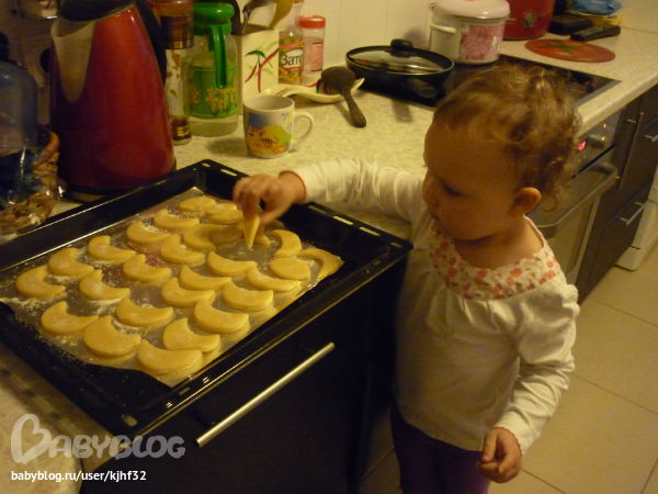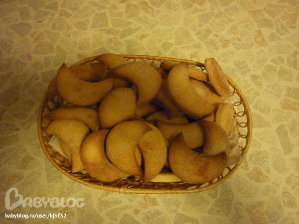 Печеньки обычные с песочного теста, потом стаканчиком полумесяцы вырезала, доча песочком посыпала, и вот красота!!!!