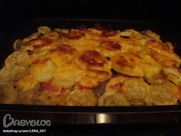 Здесь все просто куриная грудка,кукуруза,лук,сверху я под картошку добавила помидоры и кабачки,сверху тертый сыр,соль специи,залить или бульоном или водой
