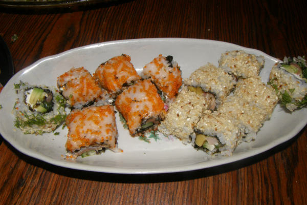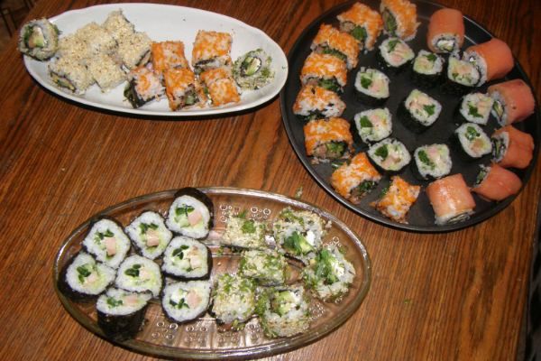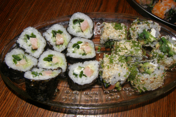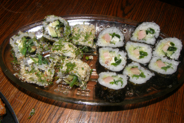 и курица копченая и сливочный сыр, и зеленый лук и икра тобико и форель, и салат ЧУКА, и огурец, и авокадо, и семена кунжута...... это все что на даный момент помню))