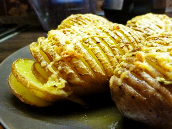 Молодую картошку в мундире надрезать тоненькими кружочками таким образом, чтобы картофелина не развалилась на части, но при этом было возможно "подлезть" в каждый разрезик и смазать его (или капунть ложечкой) смесью оливкового масла, крупной соли, приправ (я брала тимьян) и давленого чеснока. Сверху слегка посыпать сыром. И в духовку! Я сначала на 170 поставила, потом побольше сделала. Пеклось около часа.