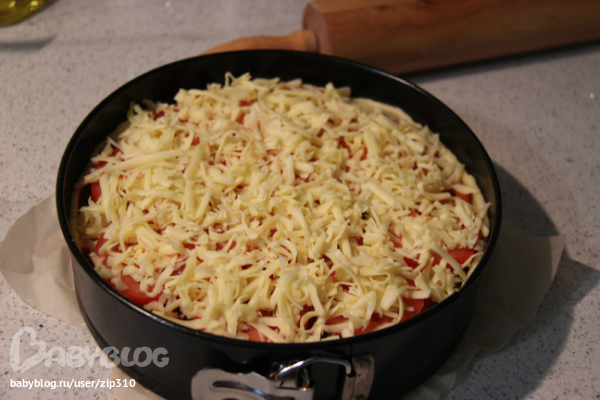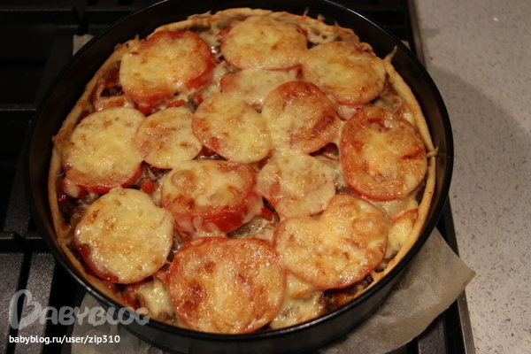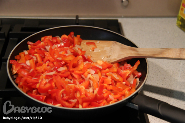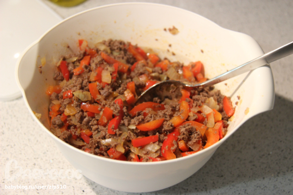 Начинка: 1 луковица, 3 перца, 500 гр фарша, 2 помидора, 1 ч ложка молотой паприки, специи по вкусу, 2 горсти тертого сыра.
