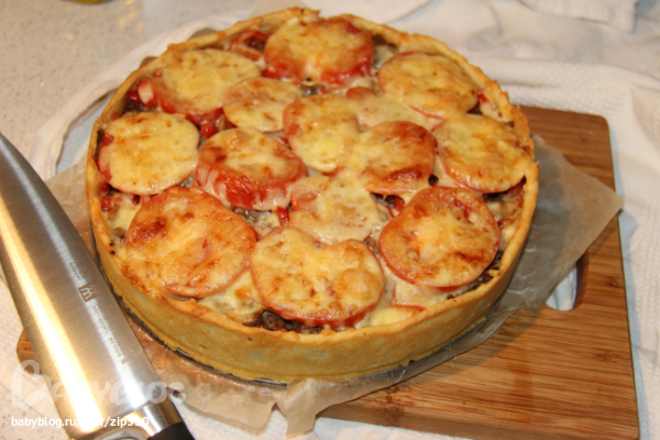 Картофель отварить, слить воду и размять в пюре. Добавить масло, муку и соль и замесить тесто. Тесто раскатать и выложить в форму (у меня разъемная 24 см). Выложить начинку. Помидоры порезать кружочками и выложить сверху на начинку. Посыпать тертым сыром.