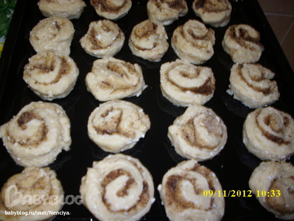 Свернуть рулетом, нарезать. Придать нужную форму завиткам. Уложить на противень, смазаный маслом или на пекарскую бумагу.