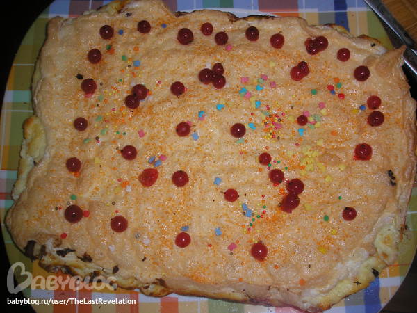 4. Достаем из духового шкафа тесто, выкладываем на него «начинку» и отправляем снова в духовку на полчаса. Пока тортик выпекается, взбиваем белки (2 штуки) с сахаром до пышной пены. Получилось безе. Смазываем им десерт сверху после того, как достали его из духовки. И снова (теперь уже в последний раз) отправляем его туда на десять-пятнадцать минут. Вот и все! Торт готов!