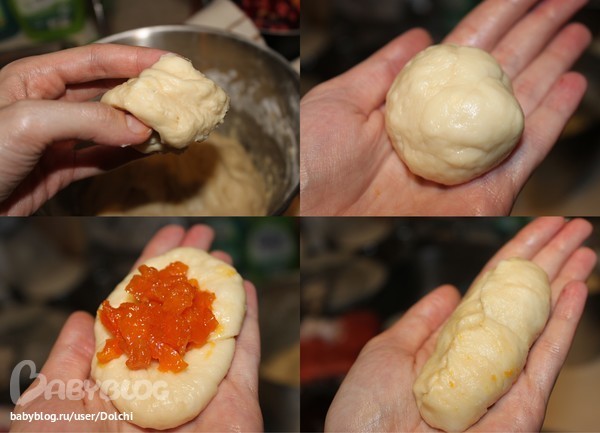 10. Когда тесто готово, его нужно опять обмять. Ставим посудину с тестом рядом с противенем и начинаем лепить. Чуть не забыла. Руки смазываем растительным маслом. Далее делаем так: отщипываем кусок теста (с некрупное яйцо, разминаем руками лепешку, внуть чайной ложкой выкладываем начинку и аккуратненько скрепляем. с каждым разом они получаются все ровнее и ровнее. Выкладываем на противень швом вниз. Самое сложное - это клюквенная начинка, она жидкова-та. С остальными было очень просто.