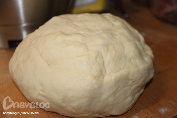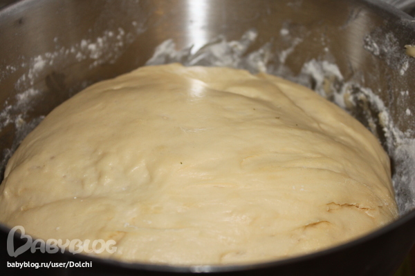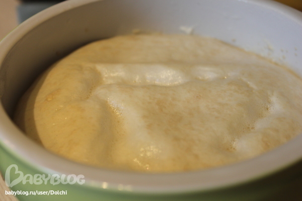 5. Как тесто поднялось примерно вдвое, нужно его обмять, накрыть и опять в теплое место. Еще на час. В конечном варианте оно получается такое: