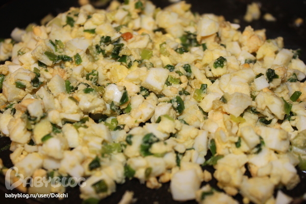 7. Начинка яичная. Яйца отвариваем, режем. Режем лук. На сковородке растапливаем примерно 1 ст ложку сливочного масла, добавляем лук, пару минут обжариваем, солим, добавляем яйца, перемешиваем. Все.