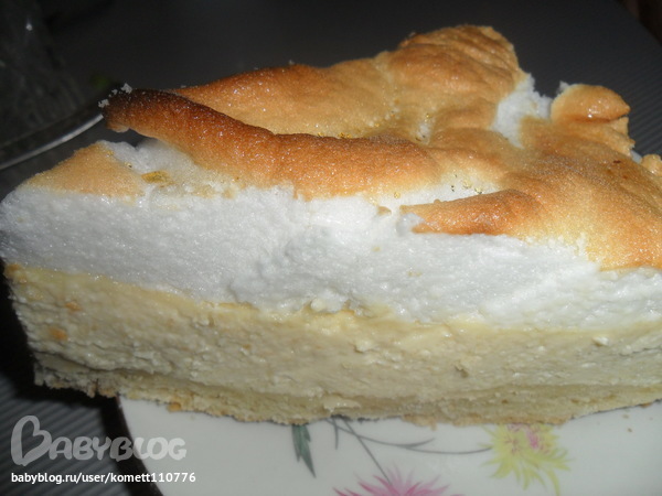 Очень понравился слой творожный. В безе добавила бы сахарку побольше, у нас какой-то сахар малосладкий. И нижний слой в следующий раз заменю на бисквитный.