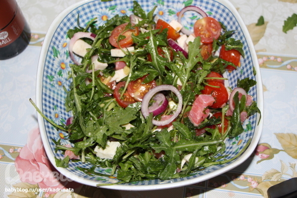 СалатыПомидоры чери, руккола, авокадо, сыр моцарелла, оливковое масло, слабо соленая форель, красный лук, сок лимона. Вкусненько получилось. Есть такой салат??? Как назвать???