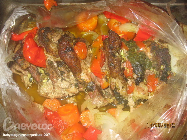 Делается все очень просто....берем хороший кусок говядины(не самый пресный) без костей.....делаем надрезы примерно через каждые 2-3 см....но не до конца....чтоб не развалилось....готовим соус : майонез+чеснок на терку+хмели-сунели+немного лимонного сока+молотый черный перчик и обмазываем щедро все наше мяско...и в надрезах тоже.....оставляем мариноваться и готовим овощи - крупно режем морковь, лук кольцами крупно и помидоры дольками....и начиняем наши надрезы овощами...просто заклыдываем их туда(перед этим тоже смазываем овощи тем же соусом....помещаем красоту в рукав....завязываем....делаем пару проколов в пакете и на противне в горячую духовку....где то на 60-90 минут(зависит от куска) при температуре 160....достаем....и наслаждаемся сочным и нежным мясом и овощами))))) очень вкусно...тает во рту