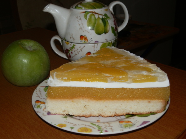 Испечь бисквит(4 желтка растираем с 200 гр.сахара+200 гр.муки+100 гр.слив.масла.Белки взбить до пены и ввести в массу) и остудить.Пакетик желатина замочить след.инструкции.2 банки консервированных персиков(по 500 гр) взбить в однородную массу,оставив чуть-чуть сиропа.В сироп добавляем желатие,растворяем его,вливаем в персиковую массу,перемешиваем и выливаем на бисквит.Ставим в холод приблизительно на 1-2 часа.Пакетик желатина замачиваем в 100 мл сливок.Сливки 33% взбиваем в тугую пену,постепенно добавляя в них растворенный желатин.Выкладываем сливочную массу на персиковую,И снова в холод на 1 час.Персик нарезать тонкими полосочками,выложить на сливки,заливаем желе для торта и оставляем в холоде еще на 2 часа