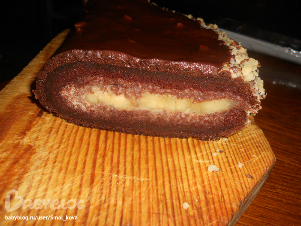 Бисквит не пропитываем. Вынимаем скалку с бисквита и намазываем бисквит кремом, затем на крем кладем целый очищенный банан, пропитанный любым любимым ликером и опять крем. Одну сторону торта смазываем кремом и обильно посыпаем орехами, можно любыми например грецкие. Сверху я поливаем шоколадной глазурью.