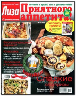 Книги и журналы по кулинарии«Лиза. Приятного аппетита!» — журнал для тех, кто любит готовить, и радовать близких кулинарными сюрпризами. Издание предлагает яркий аппетитный мир всем, для кого готовить — радость, а есть — удовольствие. Это журнал, целиком посвященный только одной теме — домашняя кулинария. На страницах издания — лучшие рецепты русская кухня и самое вкусное со всего света, советы по приготовлению традиционных и экзотические блюда. Эффектный и несложный в исполнении, любой рецепт журнала может стать «фирменным» для любителя готовить дома. В журнале «Лиза. Приятного аппетита!» — рецепты от звезд, обеды для всей семьи, новинки из магазинов, аппетитные новости, школа поварят.