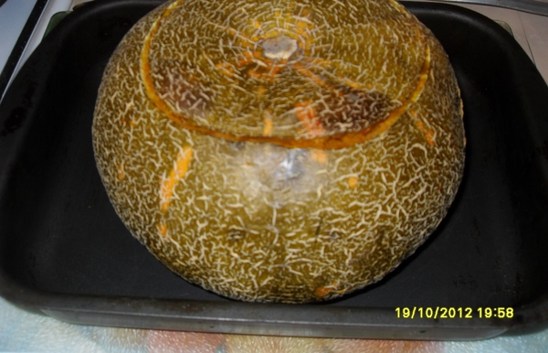 Ставим в духовку разогретую до 180 градусов, позже температуру убавить до 150. Готовится примерно полтора часа, проверять готовность ножом, пока не будет входить в тыкву мягко как в масло.