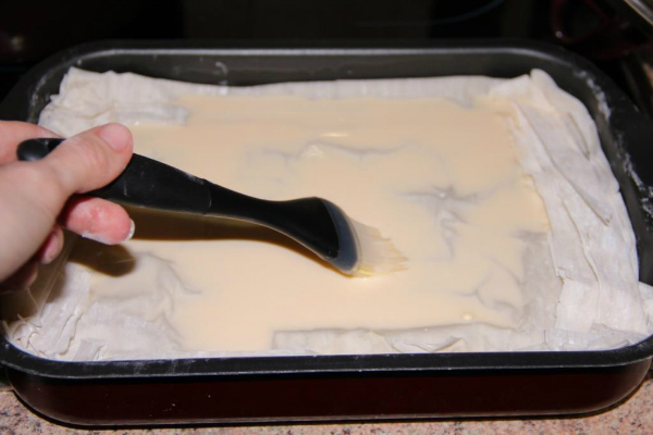 Если готовите с тестом фило, то достаточно по 2 листа на каждый слой, если с лавашом то по одному листу.