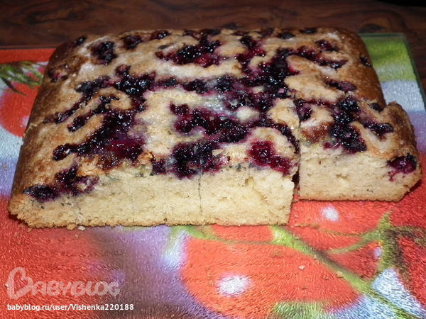 Тесто вылила в квадратную силиконовую форму, сверху насыпала немного замороженной смородины, смешанной с сахаром и крахмалом, ягодки вдавила поглубже. Получился в итоге вот такой пирожок с кислинкой. Даже мой несладкоежка муж оценил.