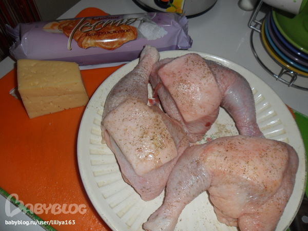 Блюда из птицыНа куриных окорочках оттянуть кожицу и внутрь полученного "кармашка" положить ломтик сыра. Кожу сверху посолить и посыпать специями (у меня "прованские травы").