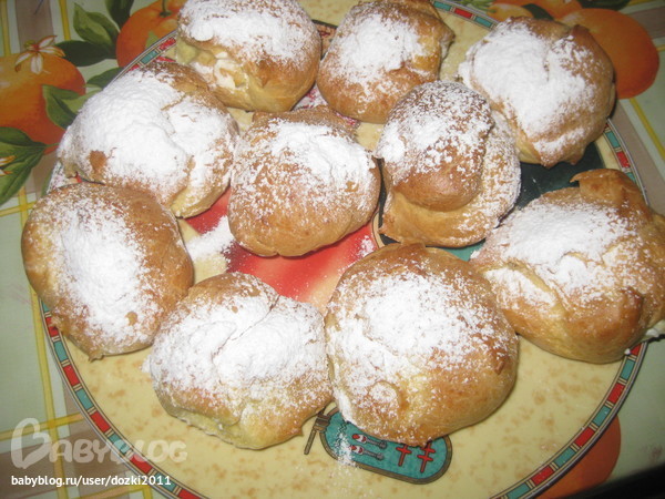 Вскипятить воду с маслом, добавить щепотку соли. Сразу всю муку высыпать и перемешать. Помешивая, поддержать на плите, чтобы просушить. Затем охладить немного. Втереть яйца. НО только строго по одному!!! Выстелить противень бумагой и выложить так как нрвится. Кружочками, башенками, трубочками.. как кому по душе). Духовка должна быть не больше 200 градусов. У меня Gorenje. Я делаю на 185градусах 45 минут - идеально получается. Но мне многие говорили, что зависит от духовки. Некоторым приодится и час держать и немного дольше. Смотрите чтоб были золотистого цвета все, значит готовы) Наполнять опять же можно чем угодно. Можно взбитыми сливками собственного приготовления, можно покупными, можно заварным кремом.Это как кому по душе...Приятного аппетита ;)