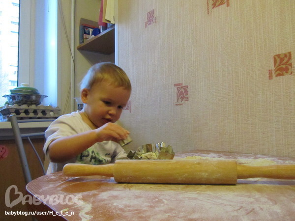 Готовила в выходной: подготовила ингридиенты и горячую часть теста сделала под конец дневного сна ребёнка, закончила тесто пока малыш полдничал, раскатывали вместе (каждый свой кусочек, скалок тоже две, ещё формочки для вырезания печенья в помощь), печётся мгновенно, 7-8 мин, главное - не передержать, чтобы не подгорело и не высохло совсем, а то жёстко и невкусно, у нас несколько печенек Владиковых зажарились, т.к. маленькие. Выкройку для домика нарисовала в Word по размерам Пряничного домика 1 с той же страницы supercook (можно в сети также скачать другие варианты, у этого стены низковаты, зато крыша слишком велика, надо бы подкорректировать), распечатала, вырезала и перенесла на белый картон. Теста как раз хватило на дом, основание и несколько печенек (снеговики, ёлочки, звёздочки).