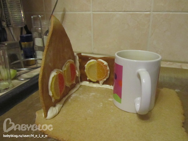 Из оставшихся белков и 2 пакетов (150 г) сахарной пудры приготовила айсинг уже когда на ночь уложила дитя. Всё просто и интуитивно понятно: белки слегка взбить вилкой (без миксера и т.п.) и подсыпая (через сито) пудру растирать до плотной консистенции - пока не перестанут расплываться следы от вилки. Под конец добавила 1/2 ч.л. лимонного сока. Засыхает достаточно быстро, поэтому работать надо оперативно. Хотя сначала кружку ставила для поддержки, то только для первой стены. Я из обычного п/э пакета айсинг для украшения наносила, т.к. забыла, куда положила за неиспользуемостью тонкие насадки для шприца, искать было некогда, а для склейки дома просто ножом намазывала. И если посыпать чем-то или приклеивать, то сразу, прямо в процессе украшения айсингом, а то у меня кокосовая стружка не прилипла - осыпалась через пару минут, как с айсингом закончила. И уходит много айсинга. Я ещё раз делала из 1 белка и 150 г пудры, но можно (и нужно!) было и экономнее. В отличие от теста, айсинг потом ооочень жёсткий, хотя ребёнку понравилось именно его грызть, а ещё окна-мармеладки.