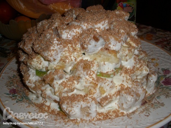 5. Разрезать коржи на кубики небольшого размера. Обмакнуть в крем. Сложить на блюдо: 1-ый слой - темный, 2-ой - светлый. Между слоями равномерно выкладывать фрукты. Затем повторить все слои.