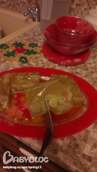 Т.к. в предновогодней суете не нашли свиной ножки, купили говяжью, такую чистую и уже аппетитную))) попросили сразу разрубить, вышло 4 части. Варила в скороварке в подсоленой воде около часа, затем вынула ножку, процедила бульон, на кусочки разделила "мяско", разложила по трем формам, добавила в бульон "Специи для холодца", в которых заведомо не было соли, покипятила еще 5 минут, разлила по формам и на лоджию!!! ааах, как я тащусь от холодца!!!!!! в этот раз немного отошла от "правил"))) обычно я мяско перекручиваю на мясорубке вместе с чесноком и сырой морковкой, затем все это в бульон и варить немного-около 5-7 минут, а в этот раз муж попросил, чтоб был студень и было , что жевать