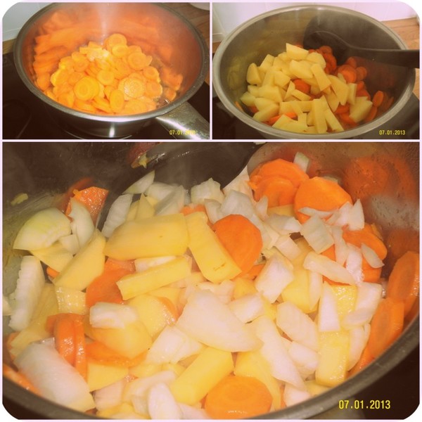 В кастрюльке обжарить лук на слив.масле с добавлением оливкового, добавить морковь и картофель и слегка всё обжарить.