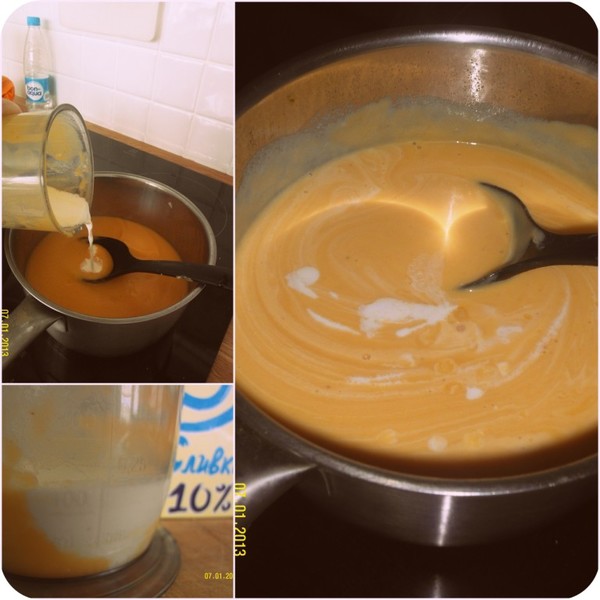 С помощью блендера суп превратить в пюре, добавить сливки и перемешать.