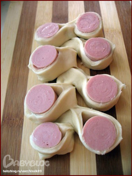 Каждый шарик раскатать в лепешку и положить туда сосиску.