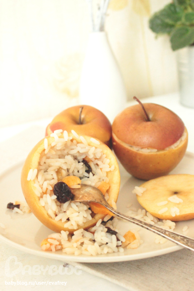 Все просто)) рис промыть, отварить, нарубить курагу и чернослив кубиками (или просто помельче) У яблок срезать "попку" и вычистить яблоко изнутри. Яблоко само по себе должно быть твердым. Рис смешиваем с курагой, изюмом и всем остальным, добавляем мед. В оригинальном рецепте была сгущенка, но я ее как-то не очень, поэтому заменила медом. Все это перемешиваем и начиняем яблоки. Прикрываем их всерху срезанными "попками" как крышечками, заворачиваем в фольгу и в духовку на 200 градусов на 40 мин. Сочно и вкусно!! А главное - ПОЛЕЗНО!!!!
