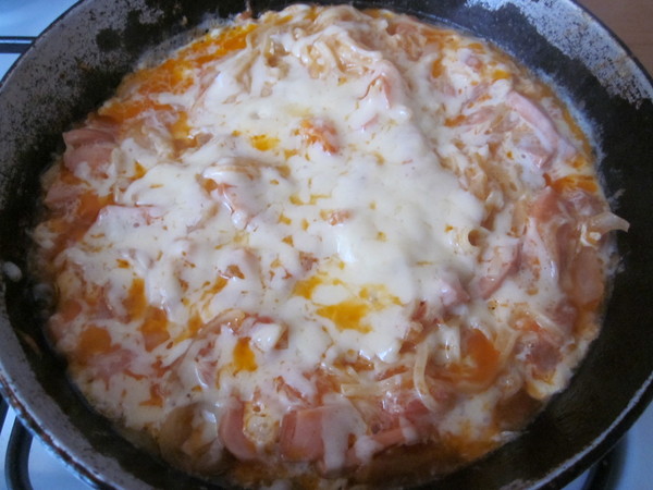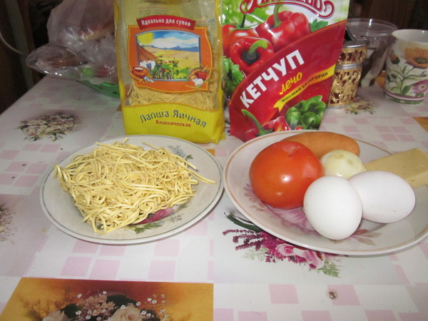 Нужно: лапша яичная, лук репчатый, помидор, сарделька, кетчуп, 2 яйца, сыр, соль.