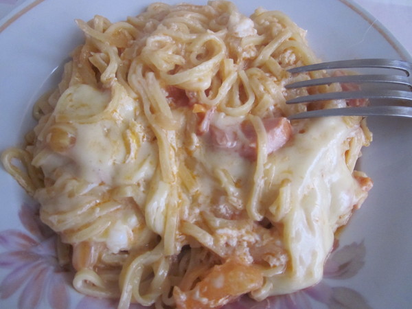 Обжариваем лук, помидрку,сардельку в течении 5 минут, потом добавляем 1 ст.л. кетчупа подливаем немного кипяченой водички, тушим 5 минут. Готовую лапшу сливаем, и добавляем её в сковородку. Перемешиваем. взбиваем 2 яйца венчиком, добавляем в сковороду,посыпаем тертым сыром. закрываем крышку,оставляем на 3 минутки,выключаем газ,можно кушать.