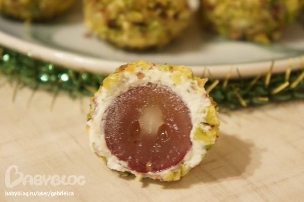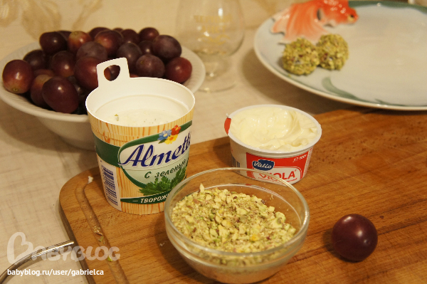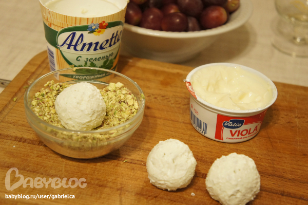 Берем круглый красный виноград, твороженный сыр, мягкий сыр, фисташки - и наши руки.