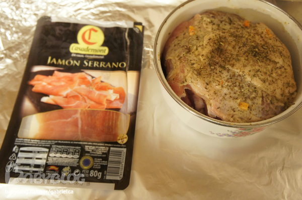 дальше на фольге раскладываем тонкие куски окорока (я брала Хамон подкопченый) и укрываем им мясо