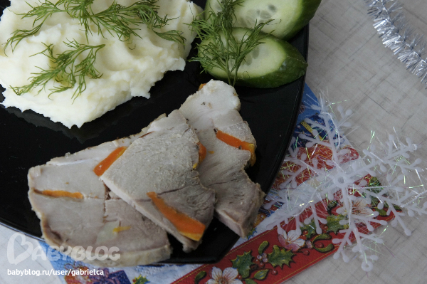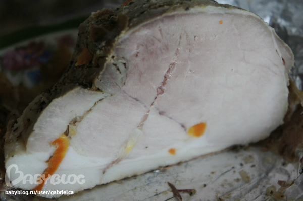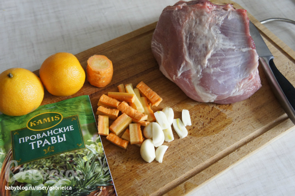 берем большой самый красивый кусок мякоти, обмазываем его солью, перцем, прованскими травами и шпигуем его чеснком и морковкой