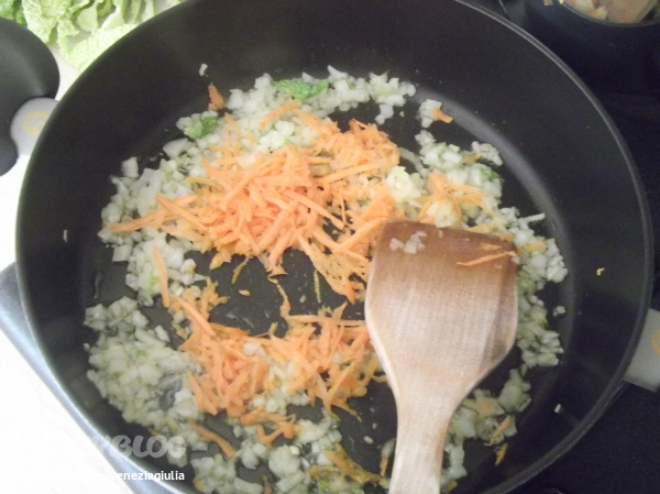 Затем лук, нашинкованную на терку морковь отправляем в оливковое масло и на маленький огонь до золотистого цвета