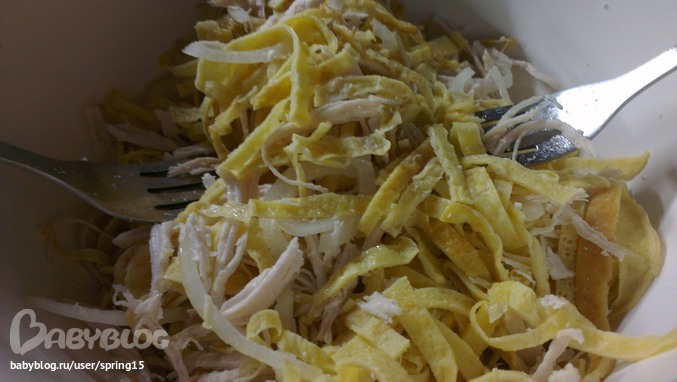 У меня свекровь такой делает,но немного по другому...Лук обжаривает,блинчики-просто 5-ть яиц взбивает и тоненькими блинчиками жарит по-румяней,вместо грудки бедра (правда когда я делала,я тоже филе брала,т.к. бедра для нас жирноватые),ну и все майонезом...)))))