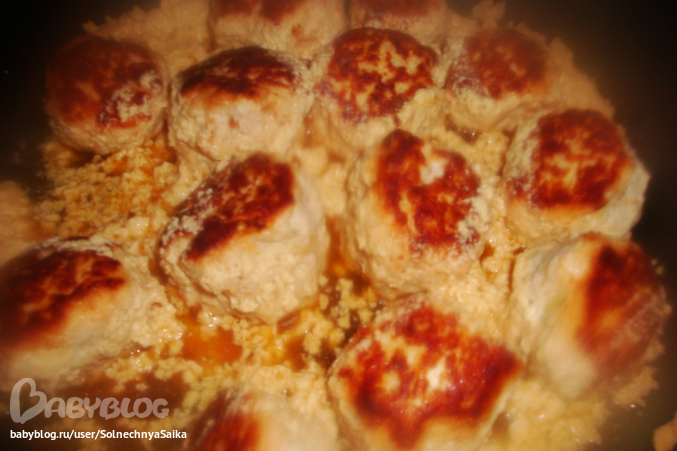 Позже мы попробовали куриные шарики с творогом, они у нас слегка излишне подрумянились (чуть не сгорели ) и сливки что-то свернулись, но все равно было очень вкусно и не сухо, а так нежно-нежно. Соня даже съела нормальную порцию, а то она обычно больше поготовить, чем поесть