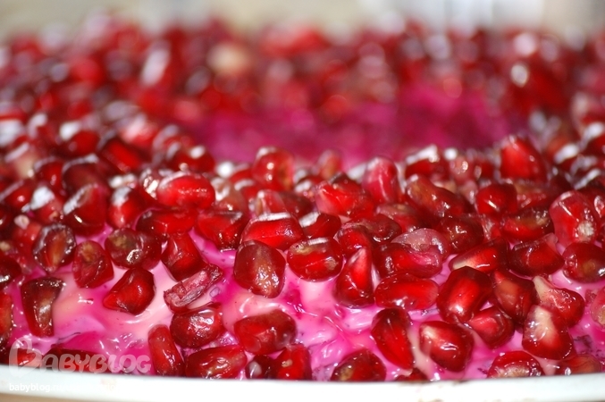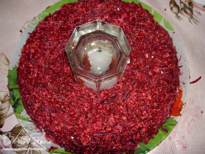 На свеклу выкладываем зерна граната, убираем стакан (очень аккуратно). Наш оригинальный салат готов. Приятного аппетита!