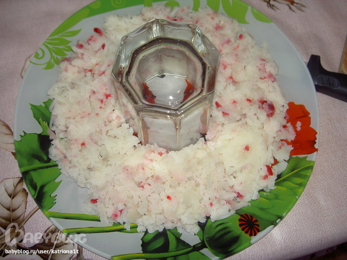 На плоскую тарелку или блюдо в центр ставим стакан. Вокруг него выкладываем натертую на мелкой терке картошку. Смазываем майонезом.