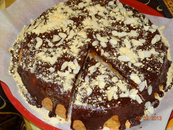 Шарлотку полить глазурью, посыпать печеньем и миндальными лепестками;