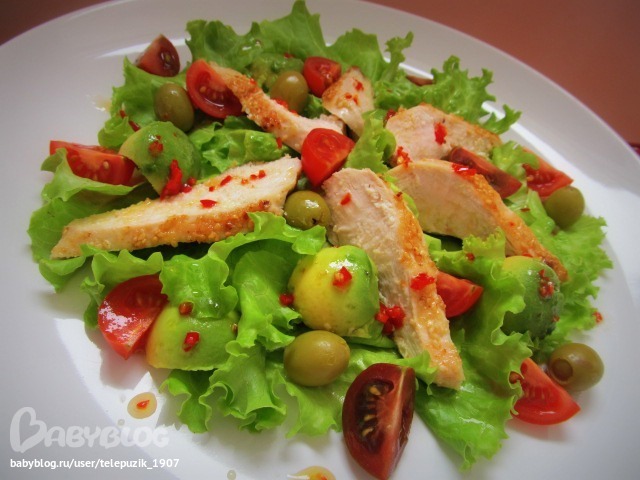 Салаты..очень интересный, насыщенный вкус, сладость авокадо, сочность курицы и острота заправки.