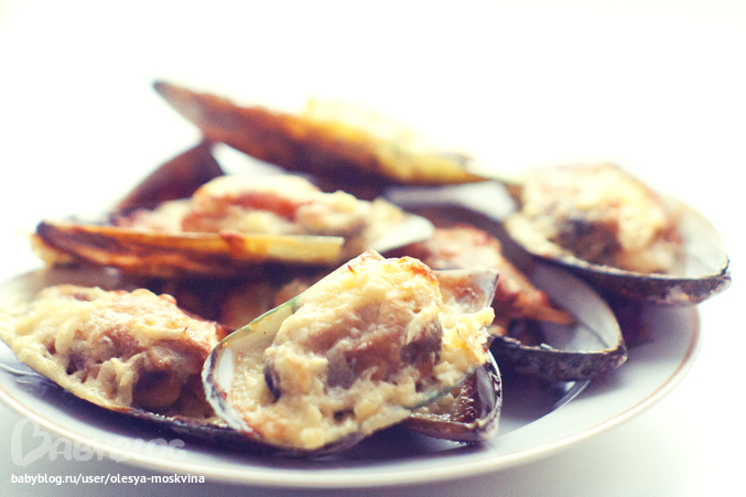 Сварить мидии и сбрызнуть лимонным соком,выложить на сковороду ,смешать сыр,чеснок тертый и немного сливок и выложить на каждую мидию и запеекать до румяности.