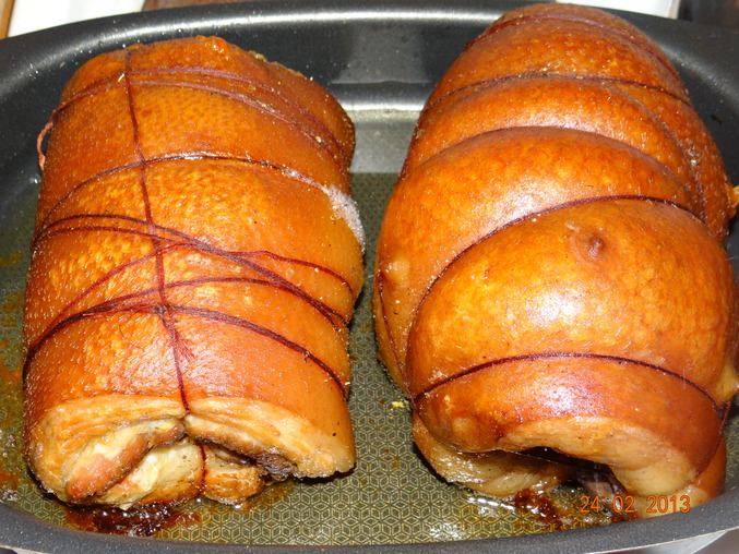 Достать рулеты, вынуть из марли, уложить на форму для запекания и поместить в разогретую духовку (200 град) для подрумянивания и подтапливания лишнего жира в нем, чтобы он не был приторно жирным;