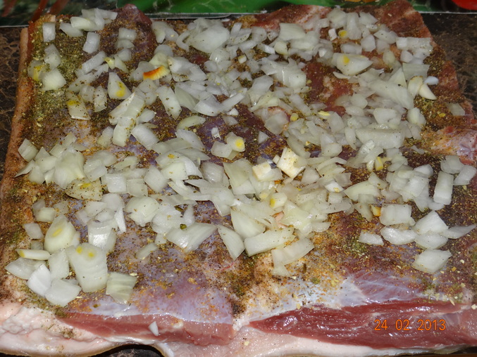 Натереть верх солью, посыпать рубленный чеснок и лук, поперчить, посыпать травами;