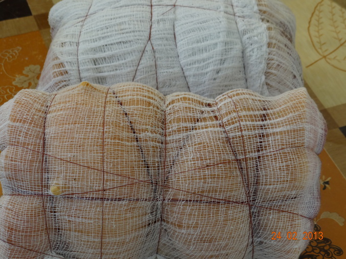 Свернуть брюшину рулетом, хорошо перевязав суровыми нитками (так как у меня не оказалось такой большой ёмкости для варки длиной в 50см, чтобы поместился весь рулет, я разрезала его пополам и свернула в два рулета, дополнительно перетянула марлей)