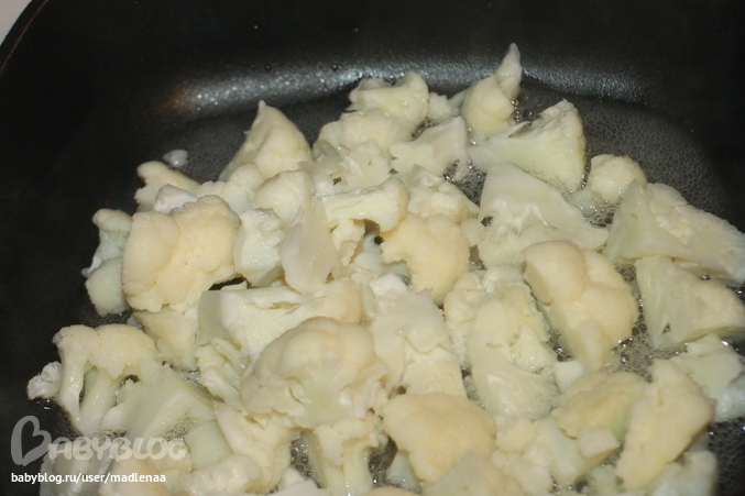 цветную капусту разделить на соцветия, уложить в сковороду и полить немного водой, а затем потушить до мягкости. Следующим этапом добавляем немного растительного масла и лука, поджариваем всё до слегка золотой корочки