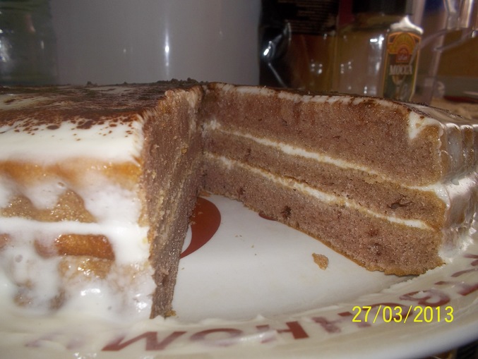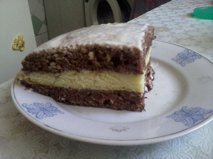 А вчера, по случаю дня рождения, испекла в форме 26 см, сделав тесто 2 раза, получилось 2 темных коржа, 2 светлых) Ну и сметаны в 2 раза больше, соответственно! Большой торт такой получился)) СПАСИБО!!!!!!!!!!!!!!! и вмето чернослива сливу использовала в этот раз с орешками! вот какой: