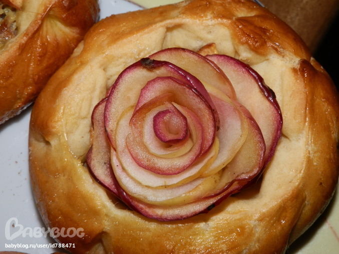 Этот рецепт я подсмотрела в телепередаче. Решила попробовать. Для таких красавиц надо заварить сироп из воды и сахара в соотношение 1:1 . Яблоки розрезать на 4 части, очистив от серединки нарезать очень тонкими дольками. Опустить яблоки в немного кипящую воду на несколько секунд до полной мякости. Яблочный чипс должен скручиватся без трещин. Вынуть из воды, дать стечь и немного остыть. Потом прикладая один к другому формируем розу. Лепестки клеятся за счет сахара. Готовый цветок хранить в емкости с небольшим углублением. После усаживания на изделие поставить на несколько минут в духовой шкаф. Приятного и красивого аппетита!